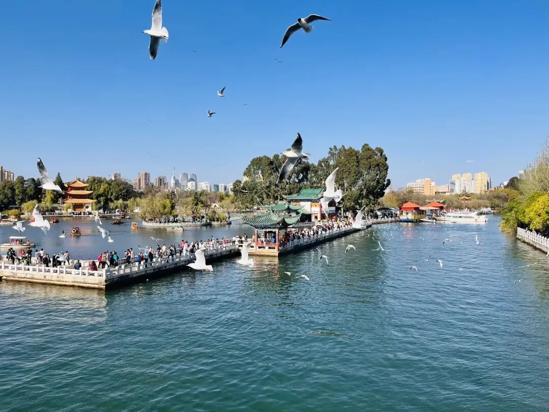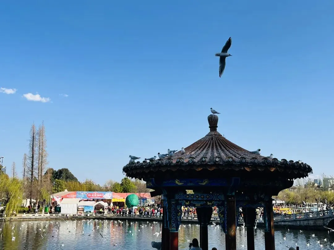大观公园里也有成群的海鸥,且这里的海鸥看着比较捧场,和游客的互动很多;也有翠湖同款的亭台楼阁,绿色屋顶,阳光洒上,折射出的温润光泽,像细碎的翡翠流动;也有碧蓝的湖水和长廊拱桥,精致的园林在湖中长出,雅致灵动。