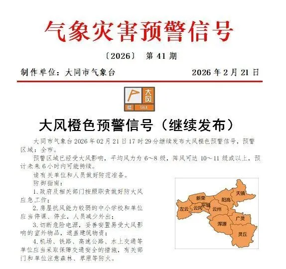 大同恒山景区遭遇极端大风天气,游客被吹得走不动道大同市气象台2026年02月21日11时38分升级发布大风橙色预警信号,预警区域:全市。预警区域已经受大风影响,平均风力为6~8级,阵风可达10~11级或以上,预计未来6小时内可能持续。山西省气象台2026年02月21日08时41分升级发布大风黄色预警,预警区域:大同市、朔州市、忻州市、吕梁市、太原市、阳泉市、晋中市、长治市西北部和东部、晋城市东部。预计未来12小时预警区域可能受大风影响,平均风力5-7级,阵风达9级以上。