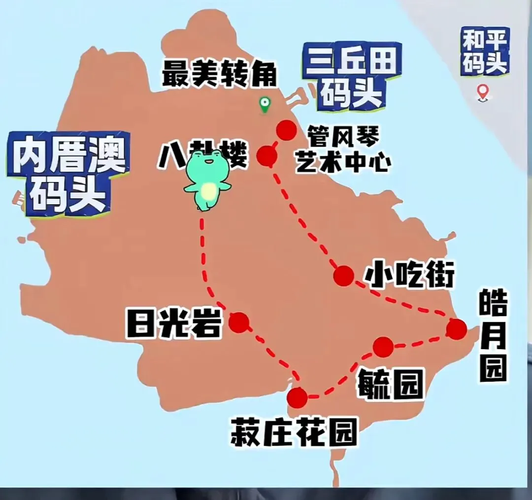如果从三丘田码头进鼓浪屿后直接导航 最美转角 → 管风琴艺术中心 (提前预约买票25元)→ 小吃街 → 皓月园(10元) → 毓园 → 菽庄花园(30元) → 日光岩 (50元)→ 八卦楼(30元) → 内厝澳码头(离岛)。