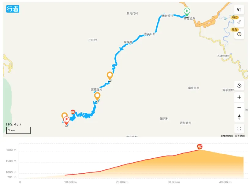 这一段从海拔大约770米开始,向西(五台山方向)一直爬坡到达2070米,再下降到李家峪村一带,累计海拔爬升约1300米。路面带有旅游公路典型的彩虹涂装,提供导航能力。