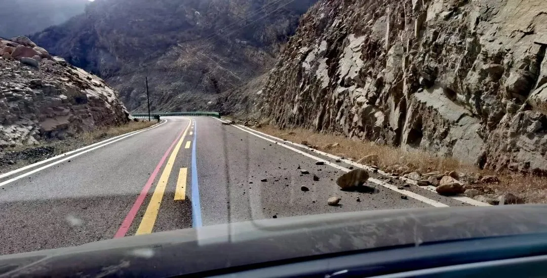 虽然部分山体安装了防护网,但覆盖范围远远不够,公路路面上随处可见散落的碎石块。我开着普通轿车,有些担心压到尖锐的碎石划伤轮胎,不得不把很多注意力放在规避碎石上。不过还好全程遇到的都是静态落石,没有亲眼见到石块滚落的场景。