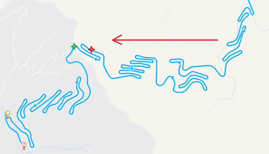 地图上看,翻过最高点还有一段下坡“十八盘”。下面图红星星的地方是封路点,绿星星的地方是最高点。虽然有点儿遗憾,不能远眺五台山方向,但是想想走过的盘山路还是很震撼的。