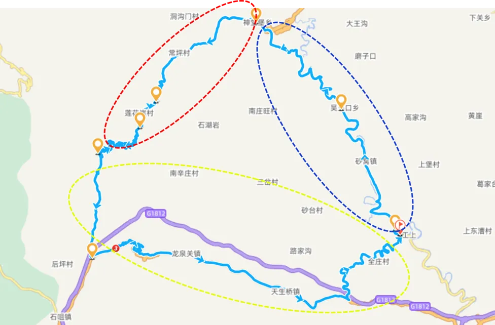 原计划是走一个约180公里的环路(见下图),却因为封路没有完成。我从阜平县出发,先走的篮圈的省道(大货车多),然后到了神堂堡,走的红圈内的太行一号,黄色圈的线路因为封路没走。