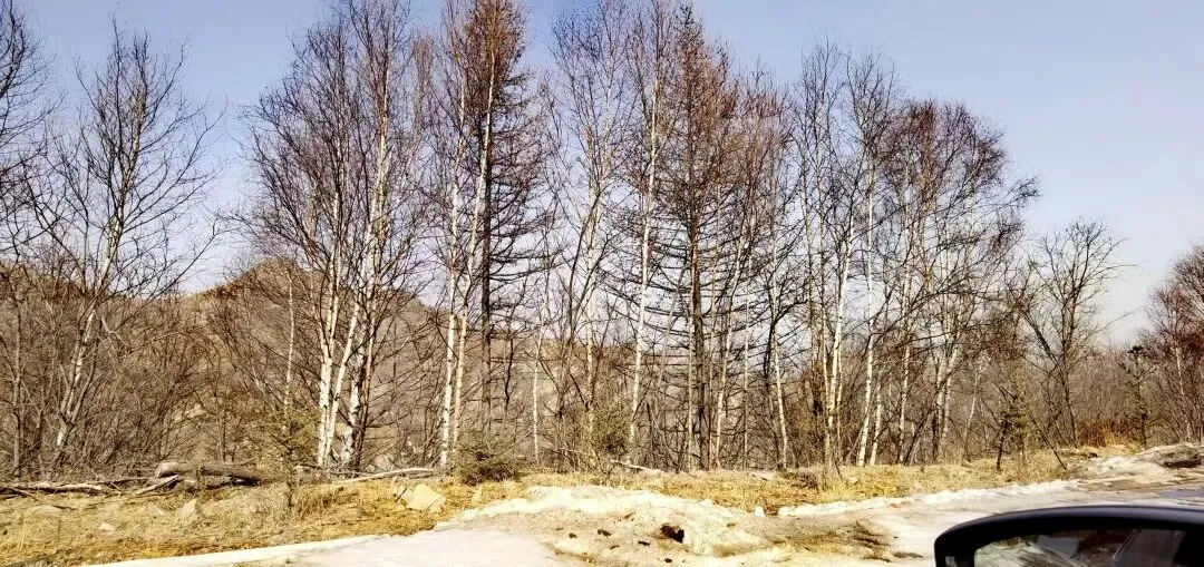 初春时节,没有任何植物发芽开花。山的阴面白桦树覆盖率比较高,如果秋天来看白桦林的黄叶应该不错。