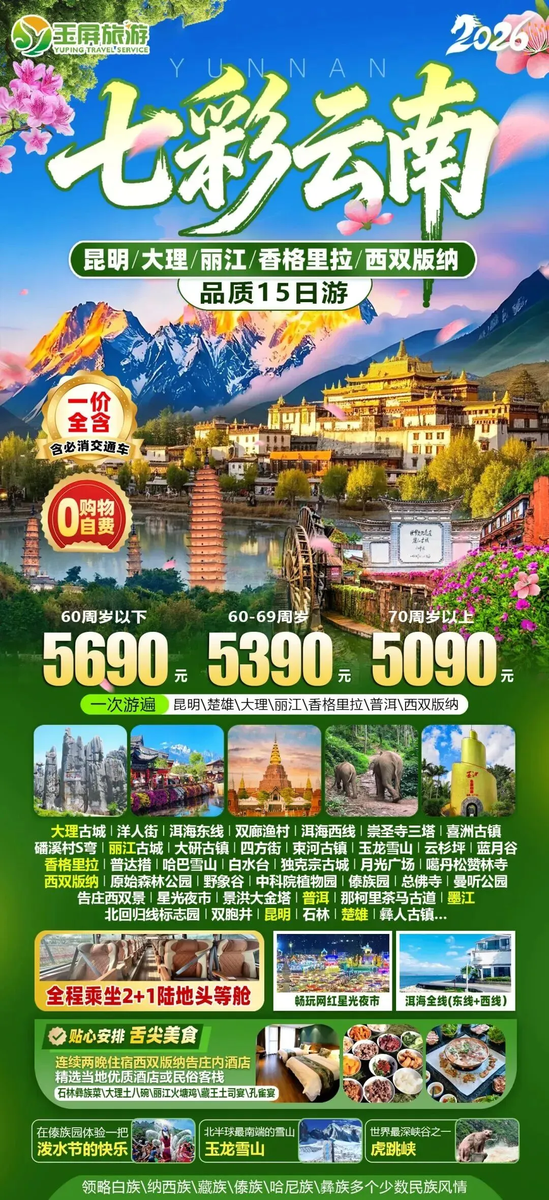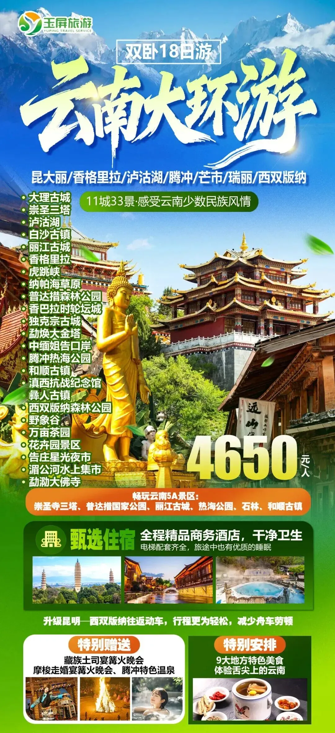 19.云南大环游双卧18日 发班日期:3月16日(满)4月9日 纯玩无购物 可改飞机 双飞14日+500元