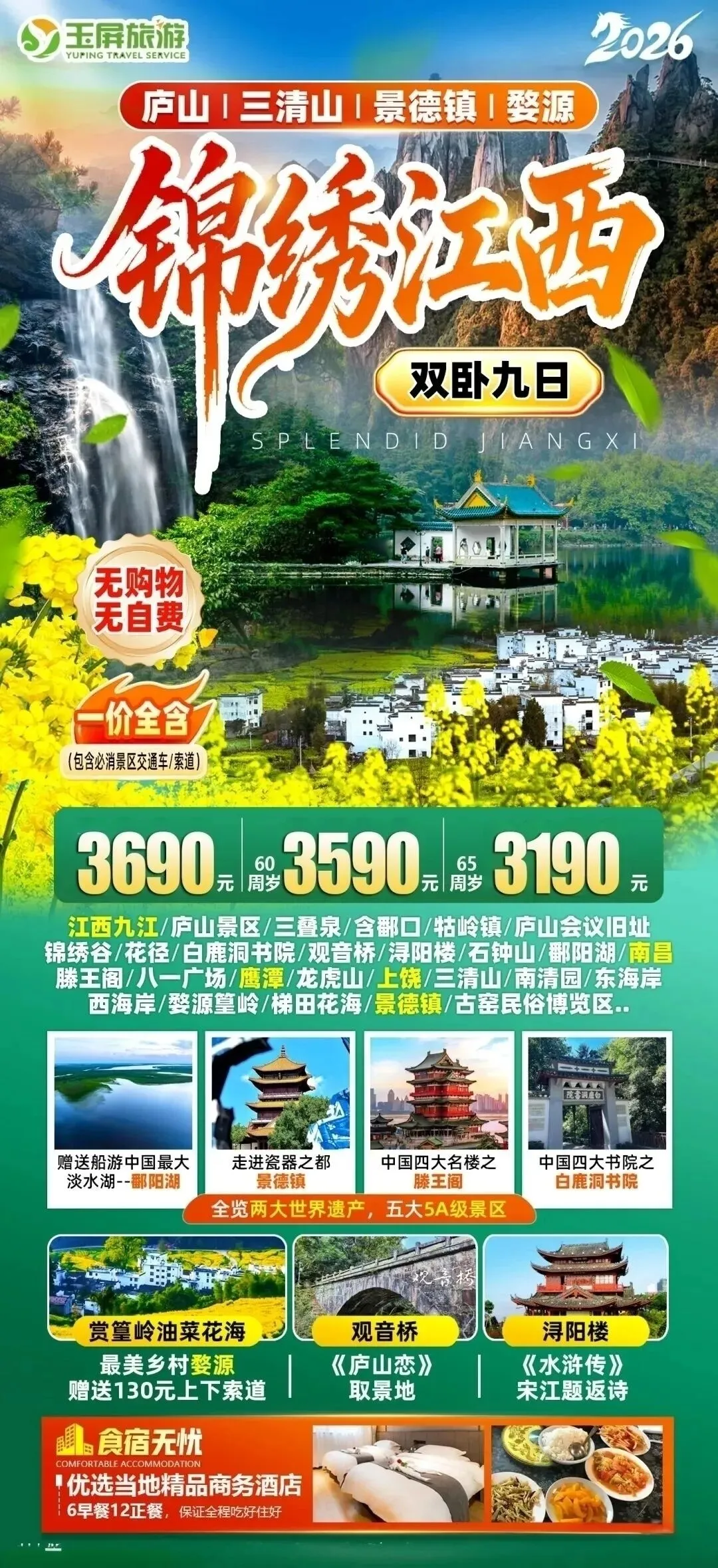 26.锦绣江西双卧9日 发班日期:3月13日🈵、16日、17日🈵,20日,24日🈵 纯玩无购物,一价全含