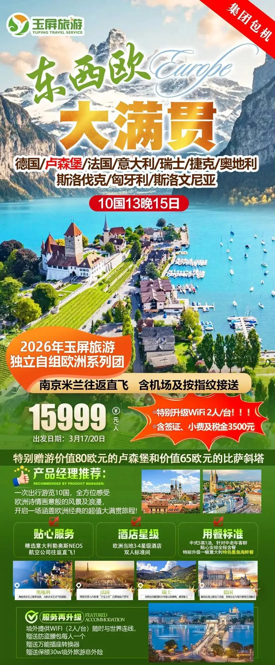 自组出境线路 36.东西欧大满贯双飞15日 发班日期:3月17🈵、20日🈵,南京直飞 南京录指纹,含接送,计划新增5月团期总价+1000