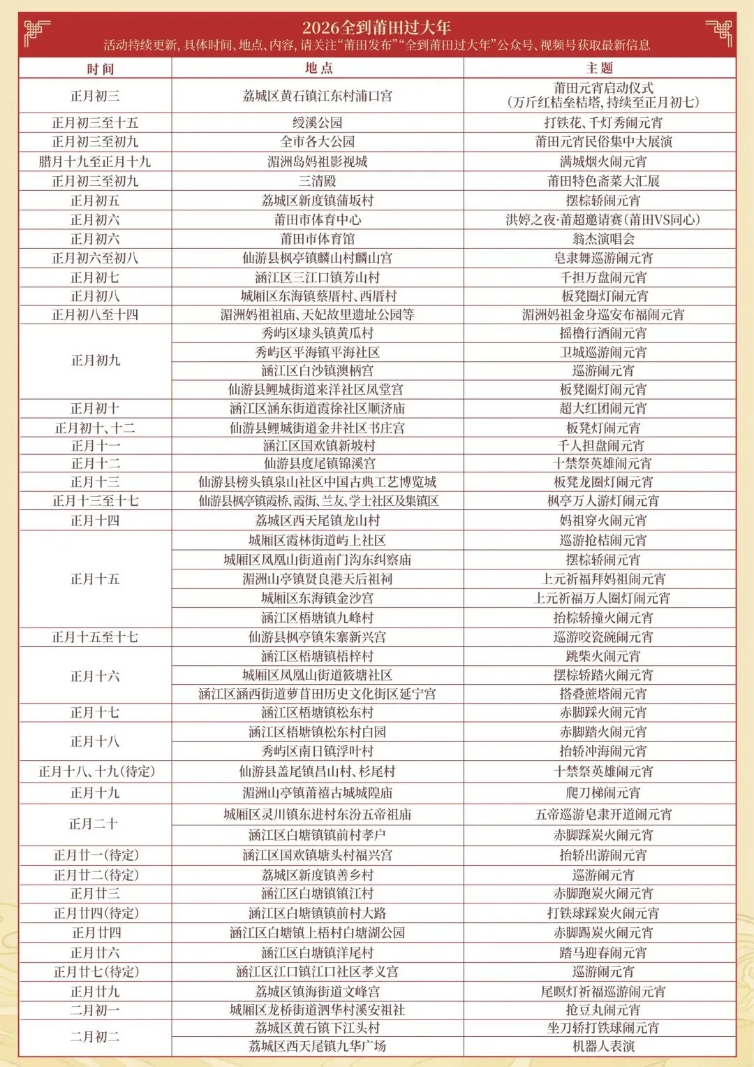 这次"一起来到莆田过大年"将持续到二月初二,大家如果还有兴趣可以根据以下时间来匹配档期!奉上一张活动全图表!大家记得收藏!