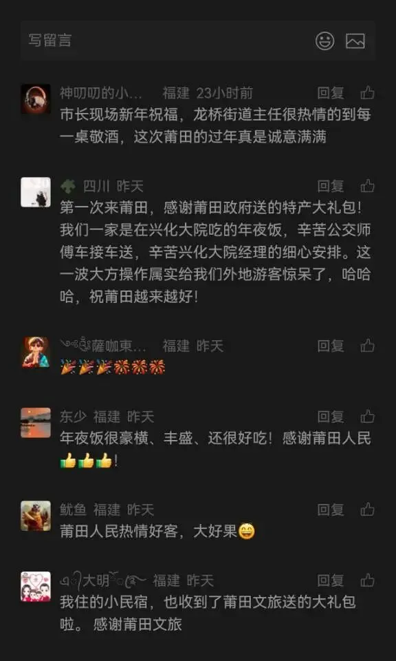 莆田举办“免费年夜饭”活动全市约1000家酒店(包括民宿)参与外地住店游客等可以免费品尝到卤面、鲍鱼、焖豆腐桂圆甜汤等本地美食体验莆田春节独特民俗