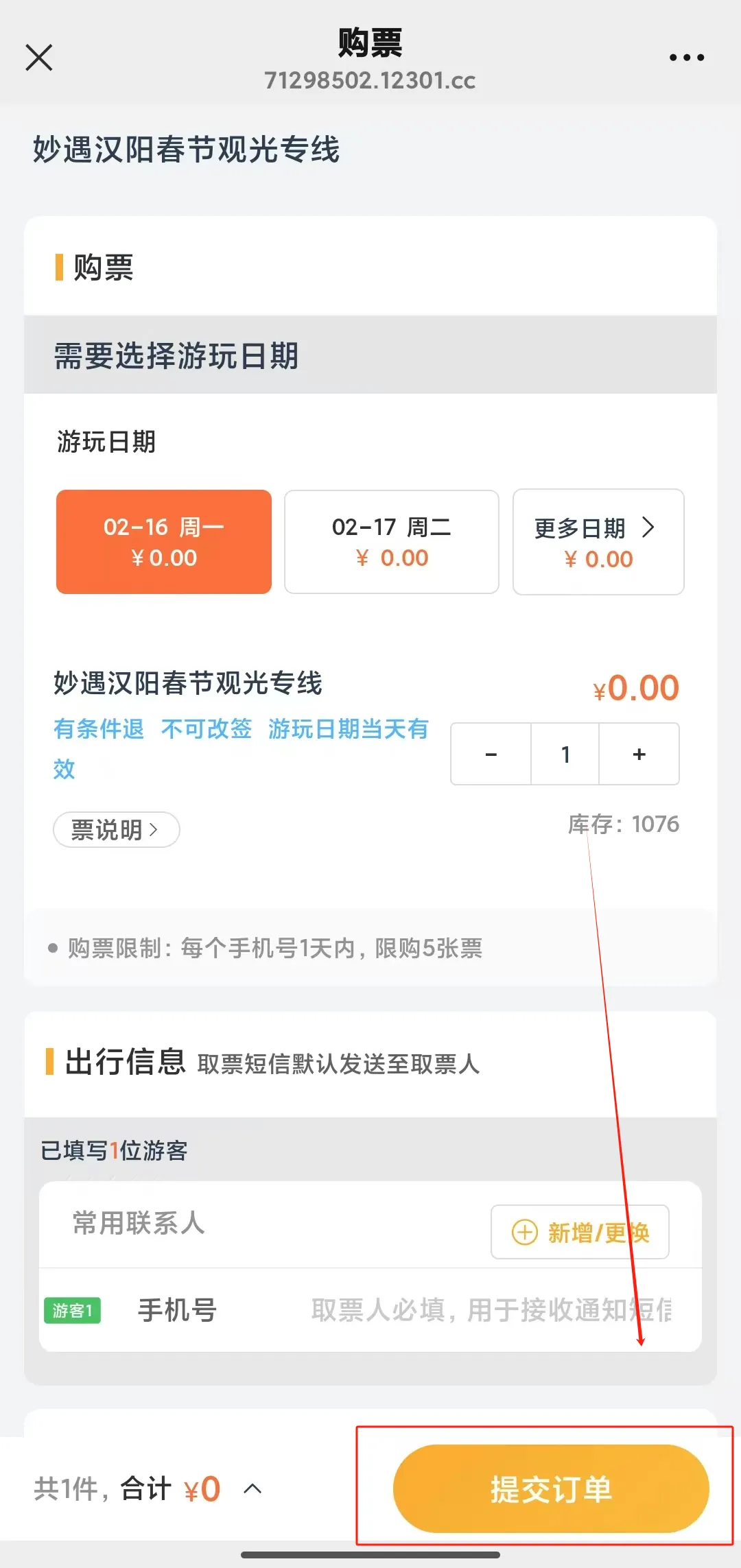 预约流程:扫码进入预约页面,点击“预订”。选择游玩日期和购票数量,填写游客信息后,点击“提交订单”即可。