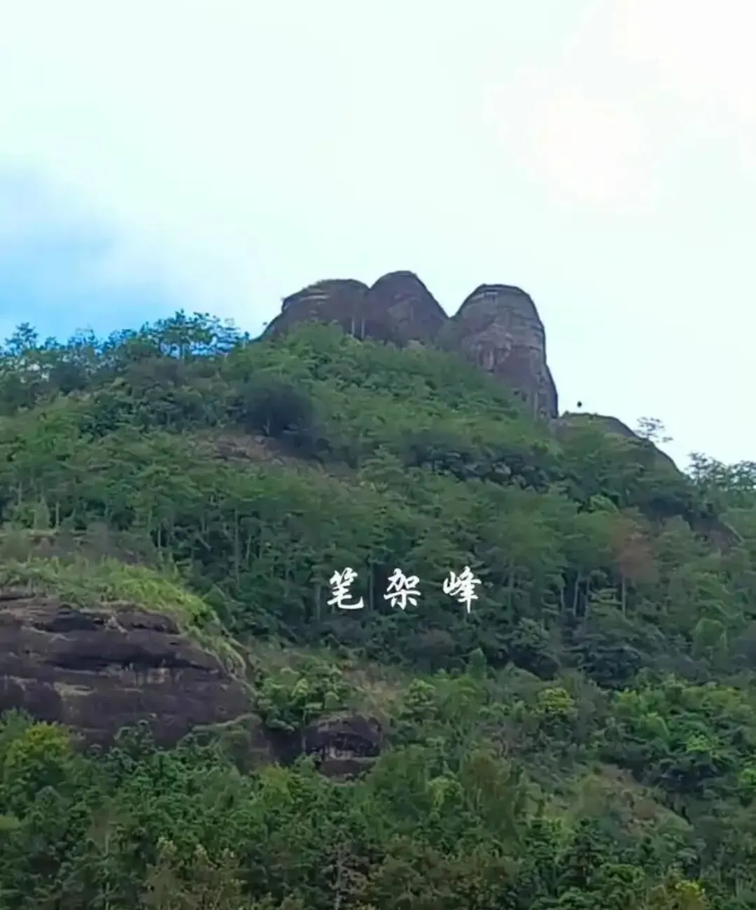 八曲→七曲溪南,两峰并立、圆润相依,形如并蒂莲花,也似双乳,故名并莲峰/金莲峰/双乳峰。小巧玲珑、线条柔美,是丹霞峰林里极富诗意的一景。