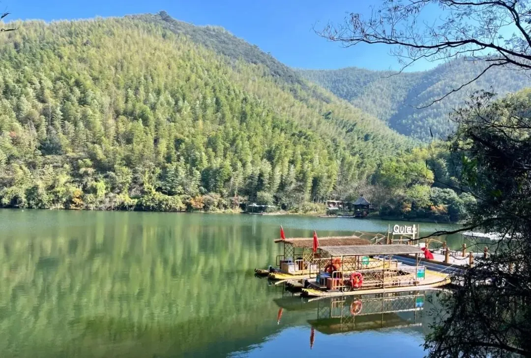 坐着竹筏漂在湖心,风往脸上吹,眼前都是绿的。湖边有露营地,夜里能烧烤、能听虫叫。