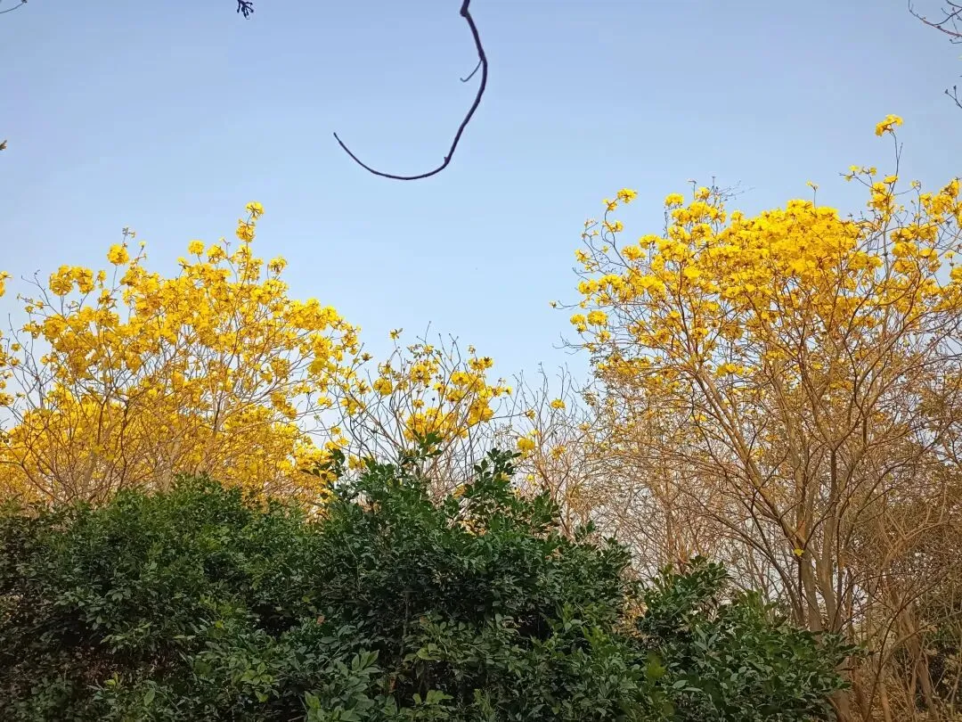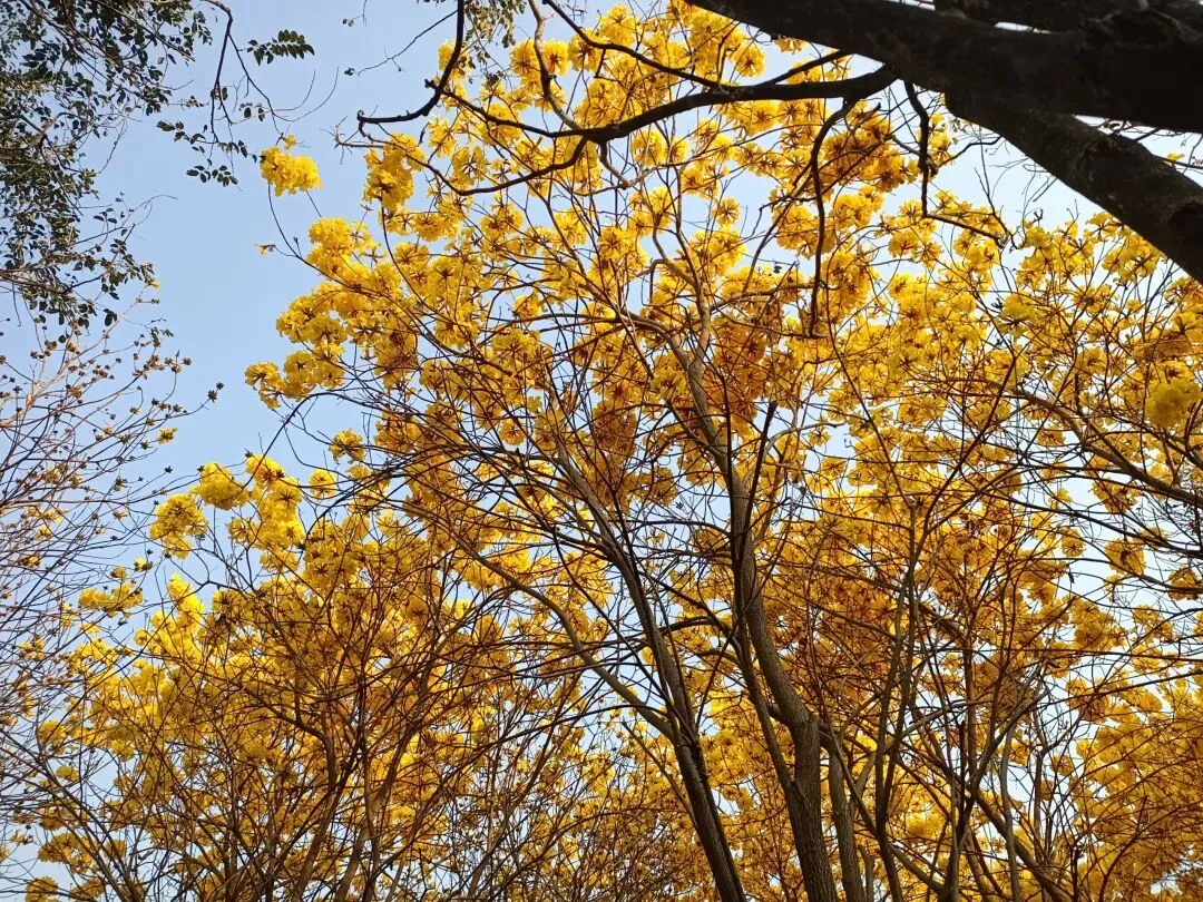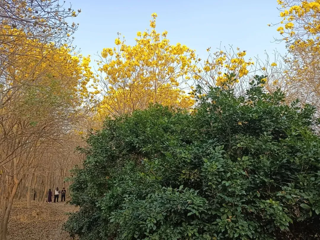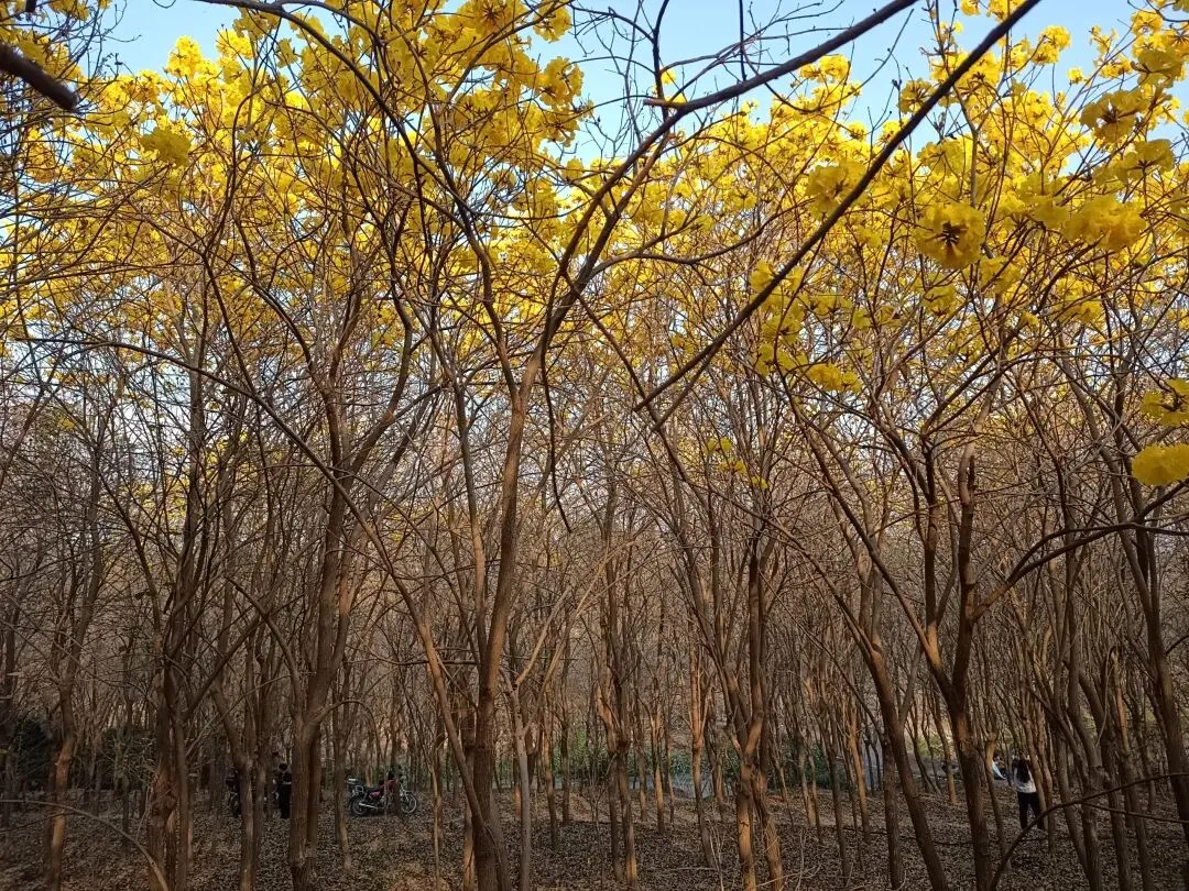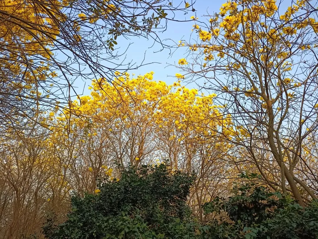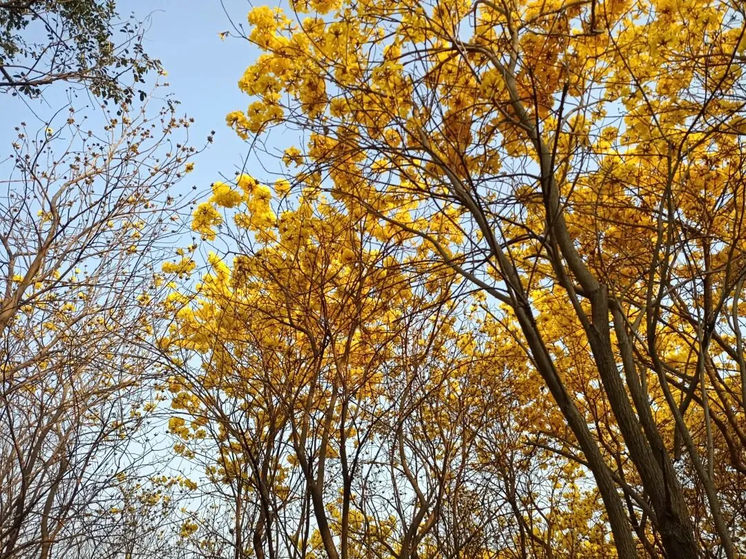 就在前几天,我们也曾经来这里看花,可树上都是枯枝。没有想到,风铃木是春天的使者,她选择在春节期间开放,她要把她的美,展示得更加淋漓尽致。