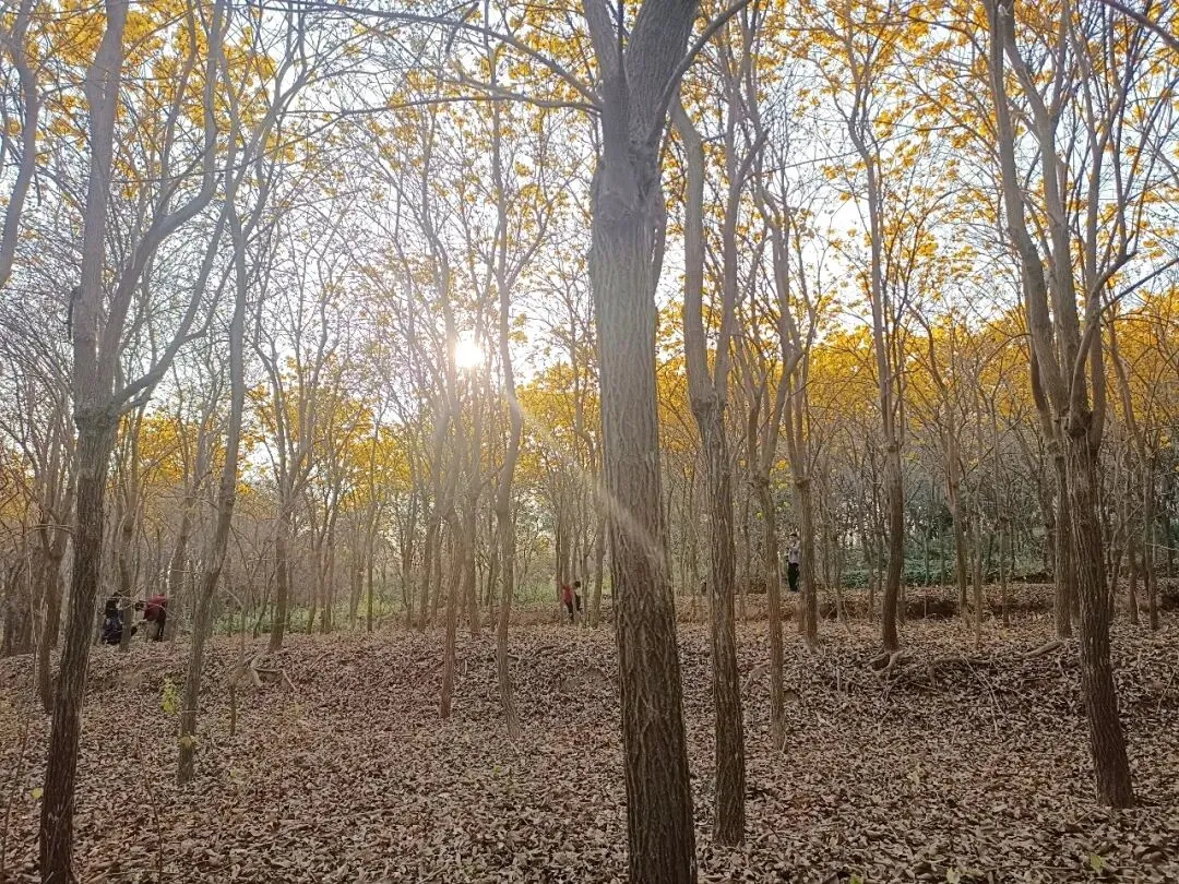 现在的风铃木,已经长得很高了,游客只能仰着头欣赏。可是,那满地的黄叶,走起来,沙沙作响,感觉还是不奇妙的。