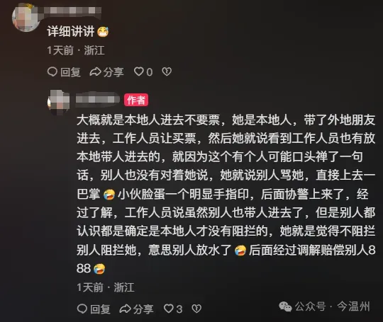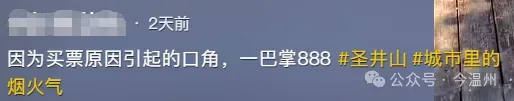 近日,温州瑞安圣井山景区,一瑞安本地女游客带外地朋友游玩,因朋友需购票而她认为遭不公平对待,与工作人员争执。争执中,一年轻小伙说了句口头禅,女游客误以为被骂,上前扇其一巴掌,致其脸部留痕,后经调解,女子为自己的冲动行为负责。