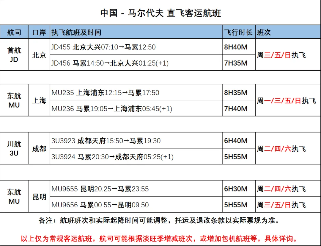 以下是目前中国-马尔代夫所有航班信息,(更新于20260107)