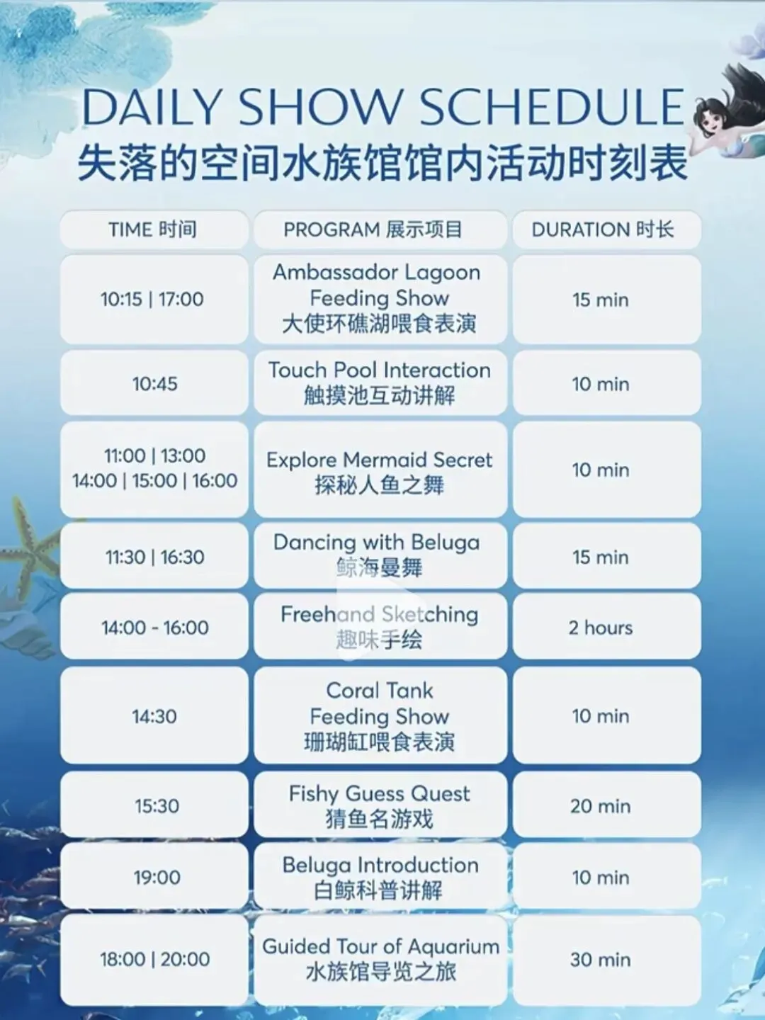 4.记得看看水族馆门口的节目表演时间表,美人鱼和白鲸表演是主打项目;