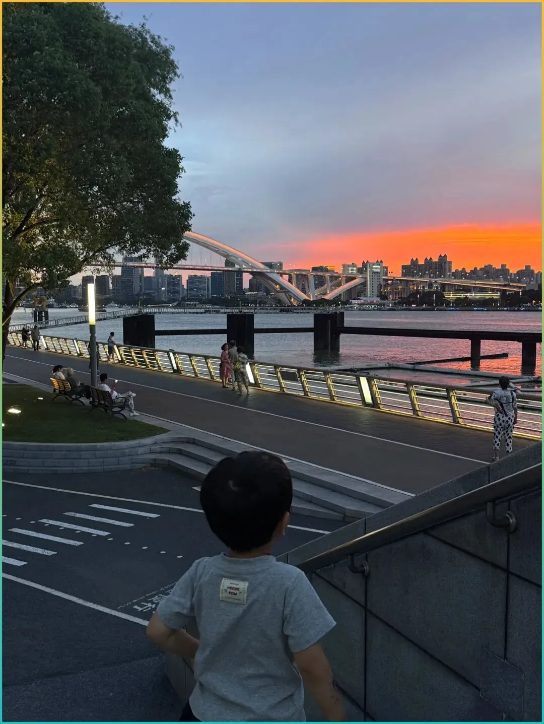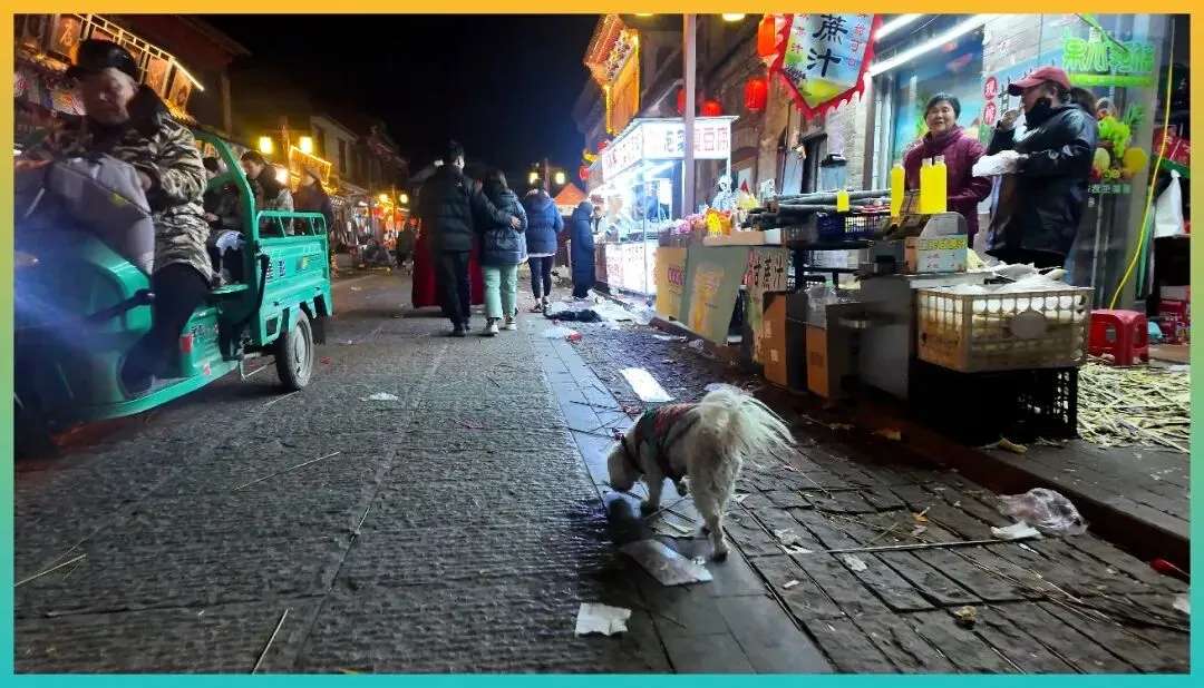 街边牛肉火锅飘着香,路上孩子跟打板鼓的阿叔合影,太有生活气了。