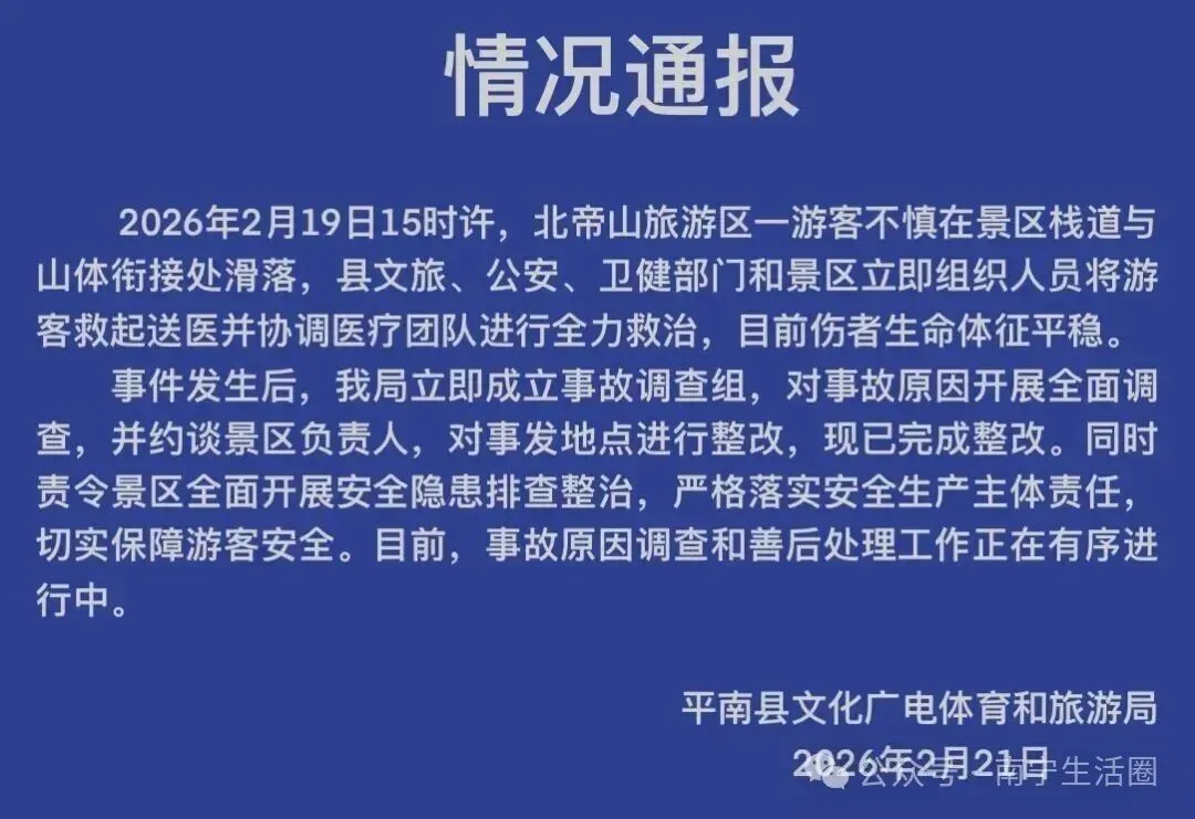 2月21日晚,平南文旅就“10岁男孩在广西北帝山景区栈道踩空坠下”一事发布情况通报: