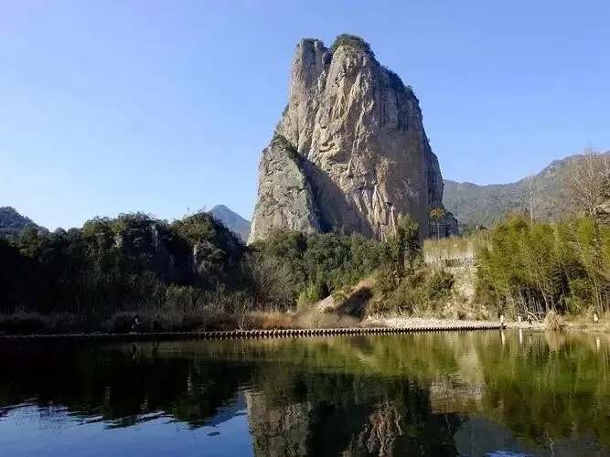 石桅岩是一柱擎天,像船桅立在水上,竹筏划过就是画。