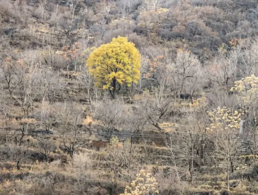 光秃秃的山上,只有这棵树的叶子依然浓密。