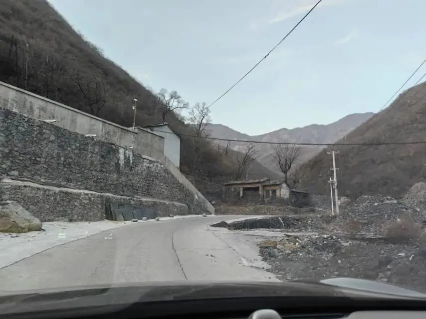 从“金鸡台村”牌楼左拐开始进入于家塌金顶煤矿路,路两侧是黑色的煤石,开车要慢,容易扎破轮胎。