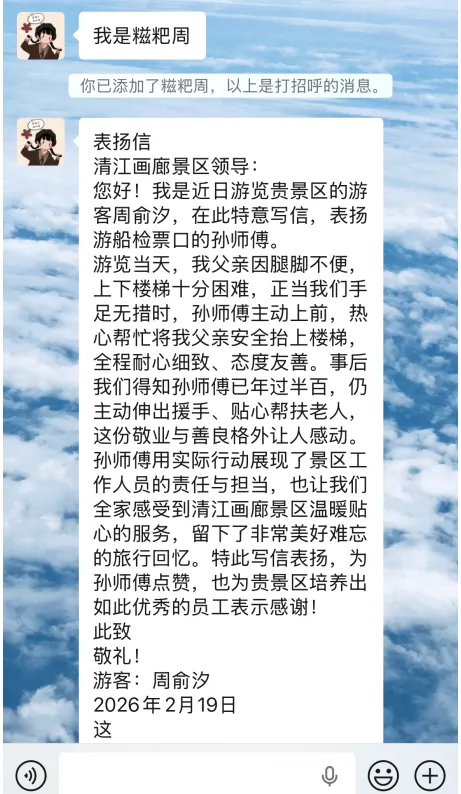 事后,周女士特意手写表扬信。信中写道:“事后我们得知孙师傅已年过半百,仍主动伸出援手、贴心帮扶老人,这份敬业与善良格外让人感动。孙师傅用实际行动展现了景区工作人员的责任与担当,也让我们全家感受到清江画廊景区温暖贴心的服务,留下了非常美好难忘的旅行回忆。”