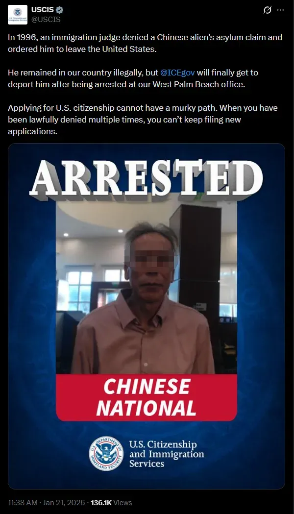 USCIS 在帖文中明确表示:“1996 年,移民法官拒绝一名中国公民的庇护申请,下令其离开美国。他非法滞留在我们国家,但 ICE West Palm Beach(佛州)办公室终于将他逮捕,可以将其递解出境。”