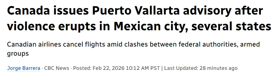 加拿大外交部今天(2月22日)刚刚更新对墨西哥旅游胜地普埃尔托瓦拉塔(Puerto Vallarta,又称巴亚尔塔港)及哈利斯科州其他地区的旅行警告,提醒加拿大公民提高警惕。警告指出,当地暴力事件骤然升级,包括燃烧车辆设路障以及联邦当局与武装团体的冲突。