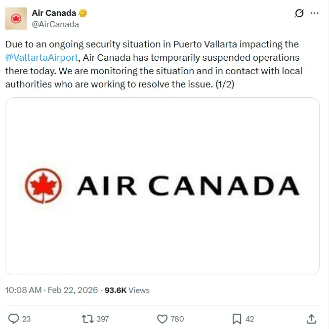 加拿大航空也在X平台发布消息称:“由于普埃尔托瓦拉塔持续的安全局势,机场运作受影响,本日暂时中止运营。我们正密切关注情况,并与当地当局保持联系。”