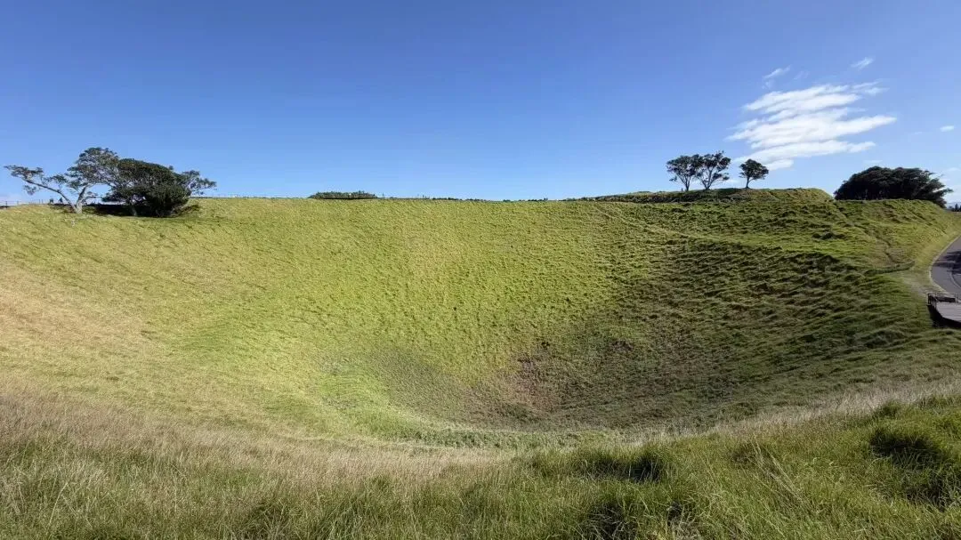 的士到达停车处左手边伊甸山铭牌,沿铭牌往上走,便见一巨碗状死火山,火山内绿草盎然,圆周几株大树,傲然点缀。