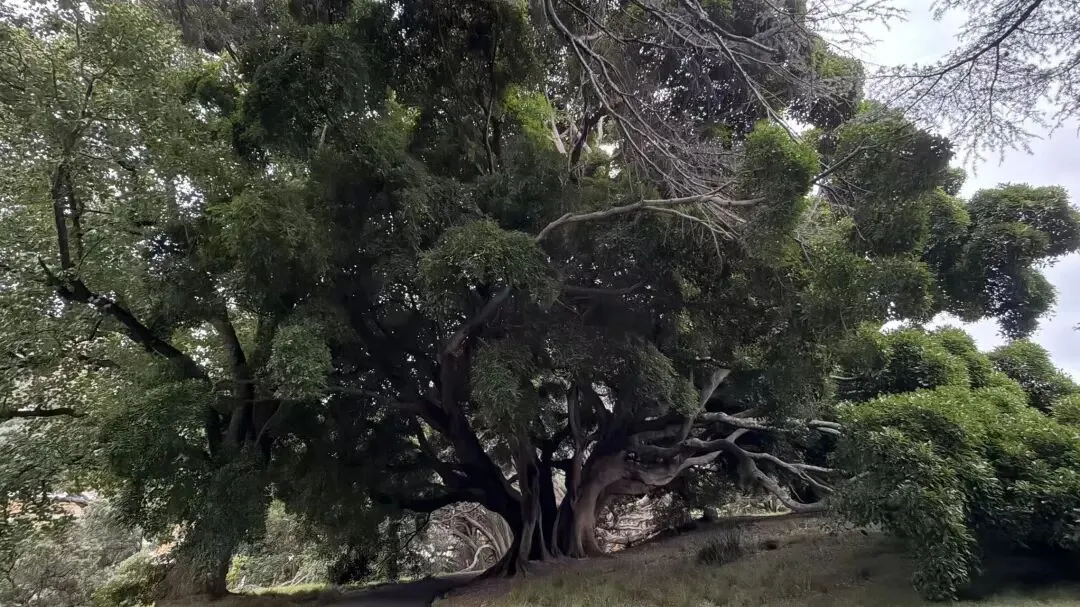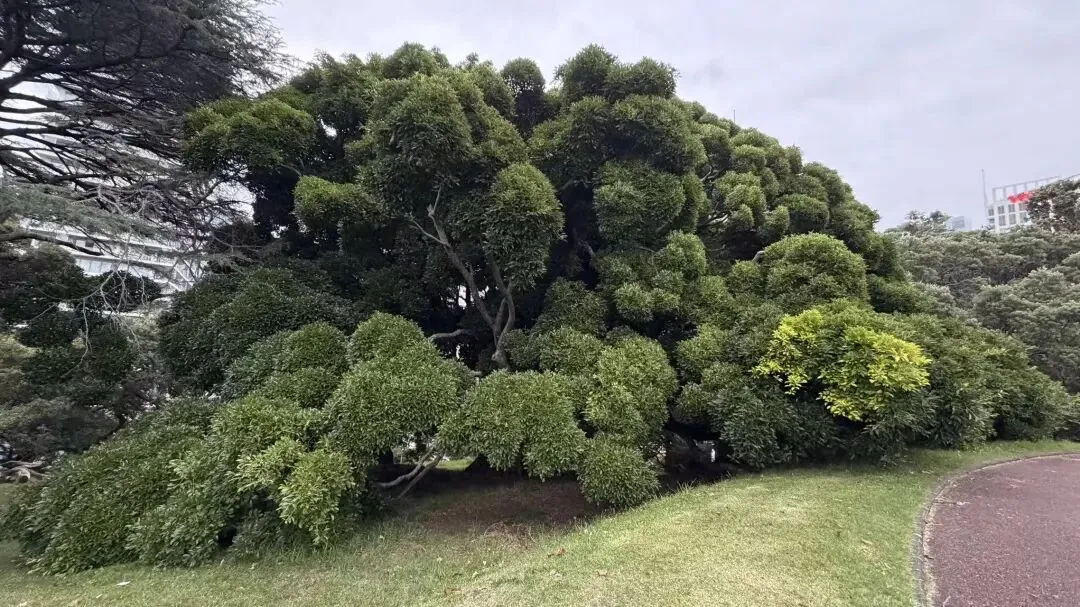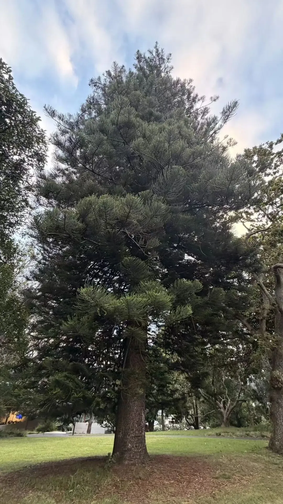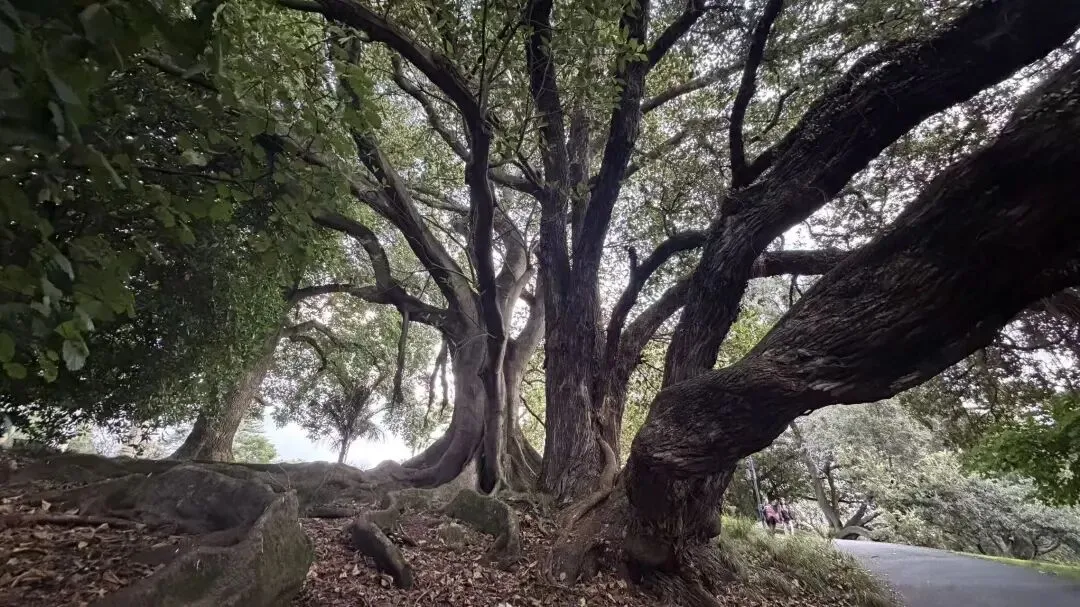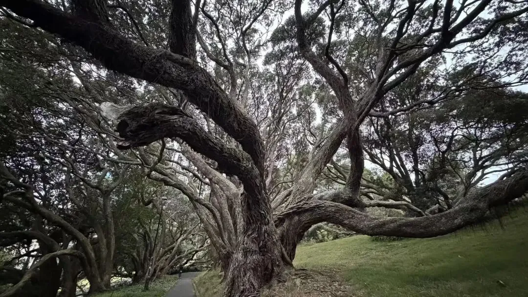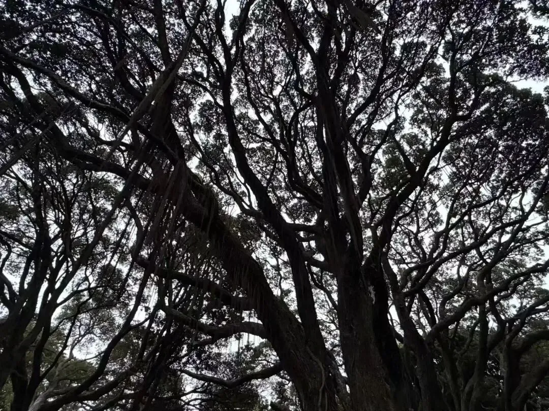 穿过公路沿石阶向上右转,看见几株巨树树干群生,枝条粗壮,恣意伸张,铺天盖地,愈往里走巨树越多,没有最巨只有更巨:松树、大叶无花果、榕树等无论远处拍照还是树下穿过,发自肺腑震撼树如巨伞,真是有生所见最巨的几棵。估计是新西兰岛国光照雨水多,生态适宜,树也恣意,鸟也恣意。