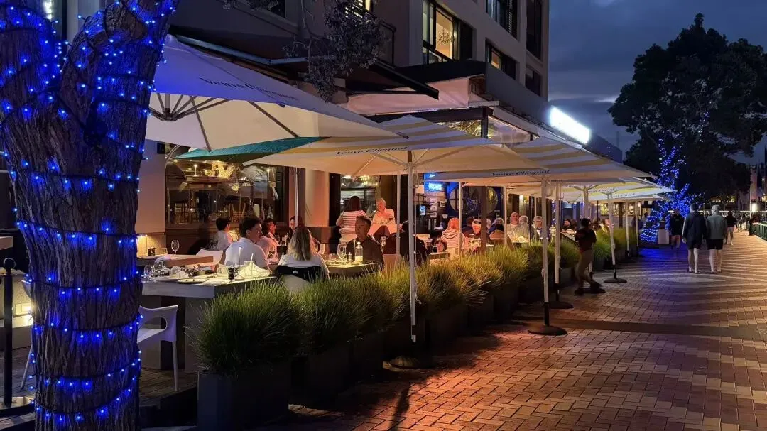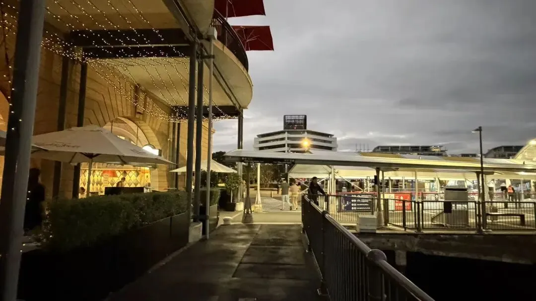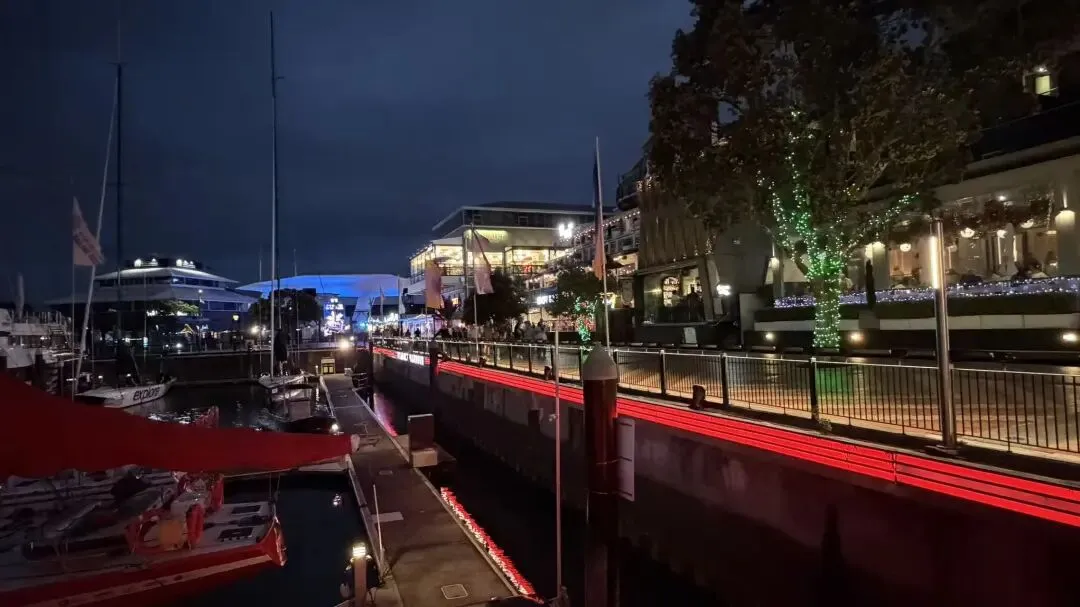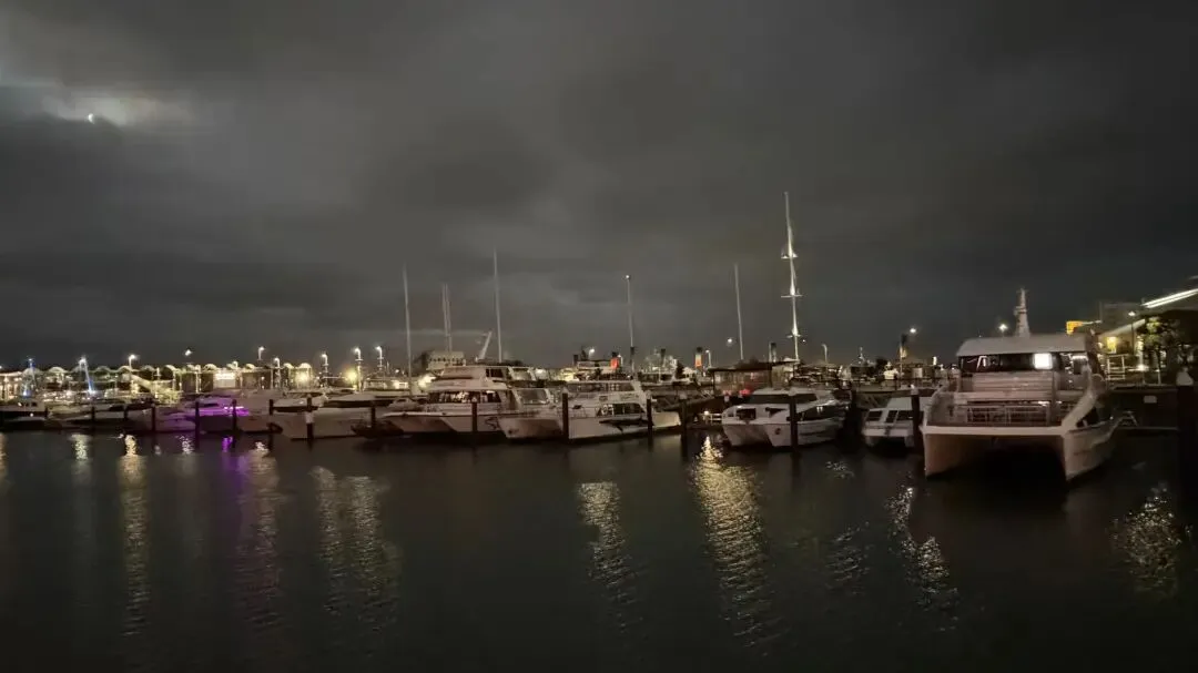 我们继续步行,晚上8:30天色渐黑,夜空墨云堆积,弯月腾耀,码头游艇帆船霓虹灯下轮廓隐现,酒吧正闹。