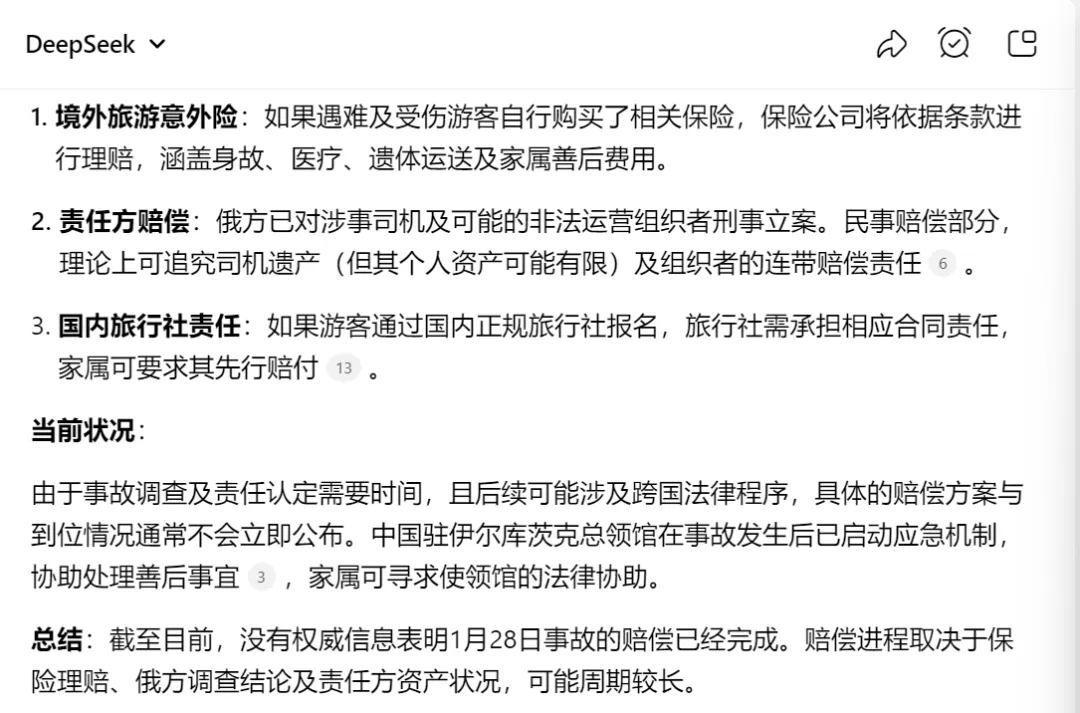 退一万步说,即使在日本、新加坡及欧美等国家旅游出现事故,抢救、善后、赔偿等后续问题也会比在俄罗斯透明、快捷得多。有网友在朋友圈说:如果事故发生在美帝、西方、以色列等地还能获得高额赔偿,死在俄罗斯估计一分钱也捞不着。这两起事故最终能否获得赔偿暂时还不好说,但赔偿过程肯定比在欧美、以色列等国家漫长,金额也远不如那么理想。我询问了DeepSeek,DeepSeek的回答是:截至目前,没有权威信息表明1月28日事故的赔偿已经完成。赔偿进程取决于保险理赔、俄方调查结论及责任方资产状况,可能周期较长。