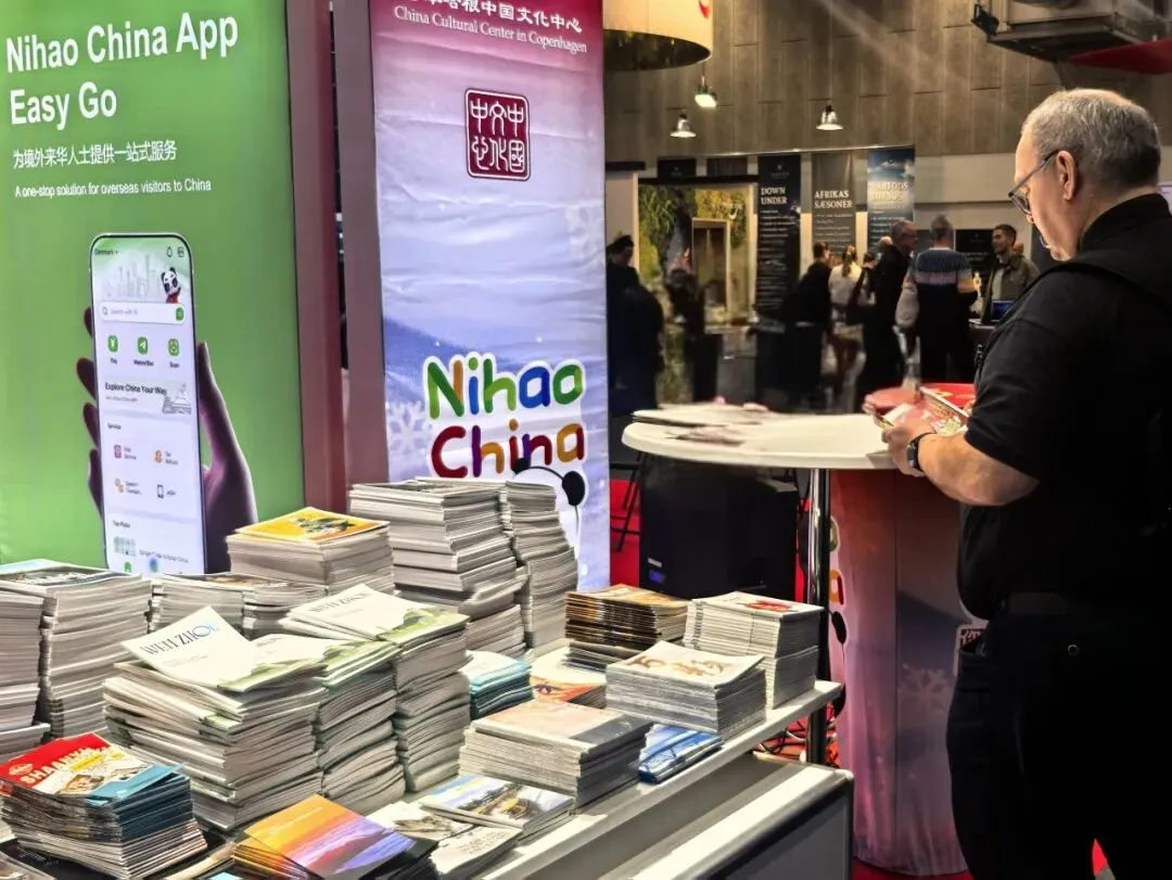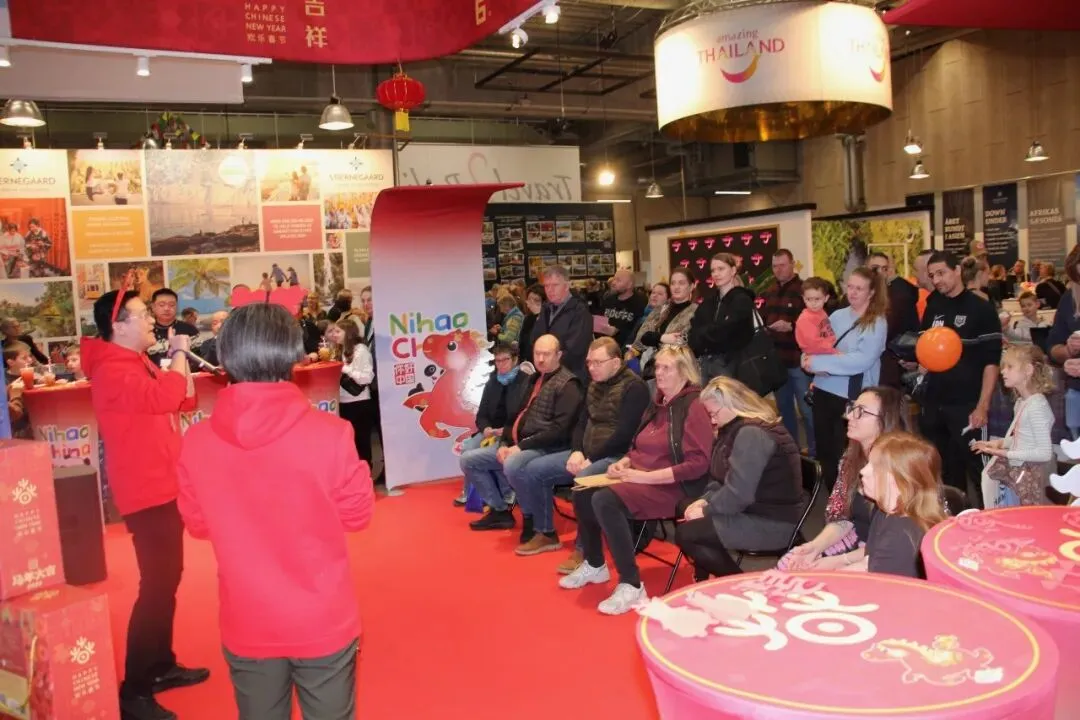 本届展会,哥本哈根中国文化中心携手中国国际航空公司哥本哈根营业部共同参展,展位采用“体验引流→深度对接→休闲转化”的创新动线设计。以“欢乐春节”“你好!中国”为核心品牌,“冰雪旅游”为二级主题,融合AI科技、民俗互动、茶饮体验三大吸睛亮点。期间,共举办入境游政策宣讲、“你好!中国”APP推介、退税政策介绍等宣介活动6场次,为丹麦游客和旅行商提供全方位的出行便利指南。