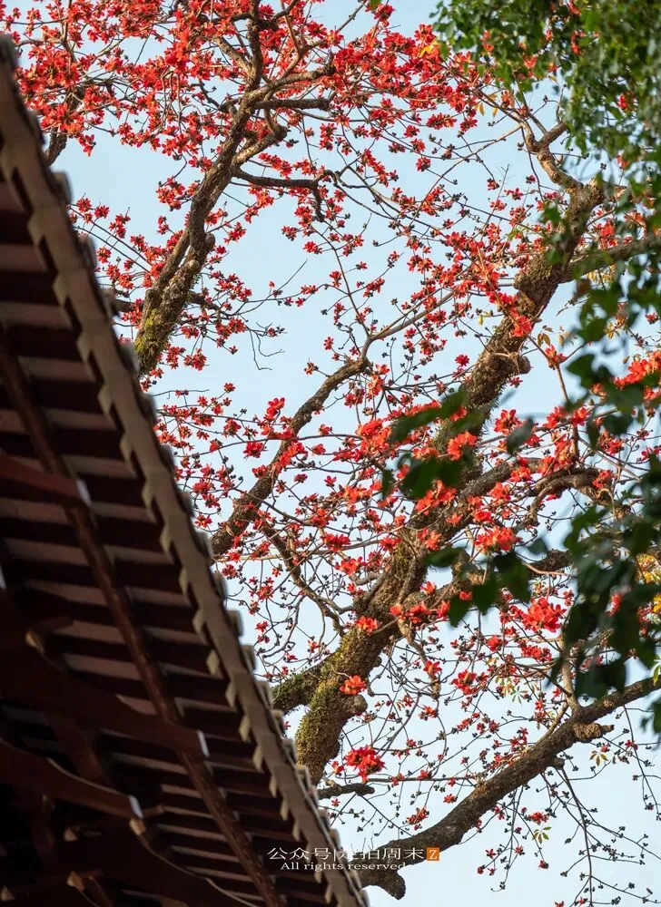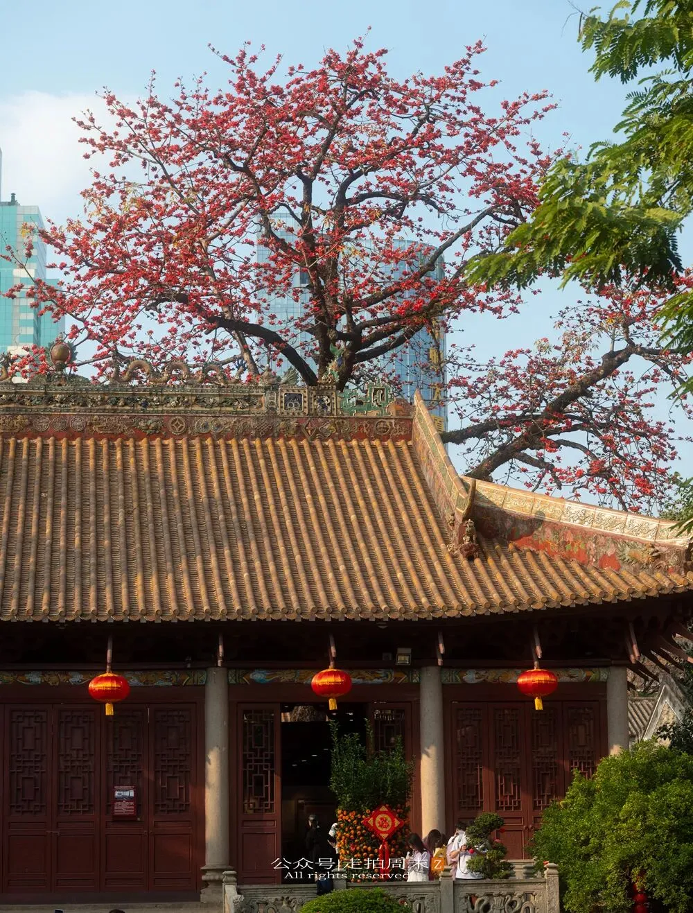 广州“小故宫”农讲所琉璃饰顶上的木棉花 今春有一个很特别的现象,那就是立春早,过年慢,还未及穿上绒裤子、羊毛衫,冬天也告结束了。由于春天的气候来得早,城里的木棉花也早开了约两周,虽然还在春节假期,但木棉花已开得通红一片了。 博主去年是3月9日才去拍刚开的木棉花的,现在看到的图片则是昨日(2月22日)就拍到的,位置就在大家都喜欢去打卡的农讲所。