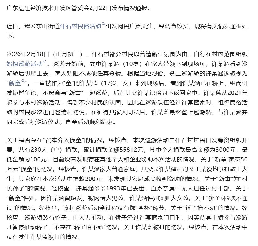 近日,我区东山街道什石村民俗活动引发网民广泛关注,经调查核实,网传50万“换童”不实,“新童”许某涵实为女孩,来自普通家庭,非“村长孙子”。