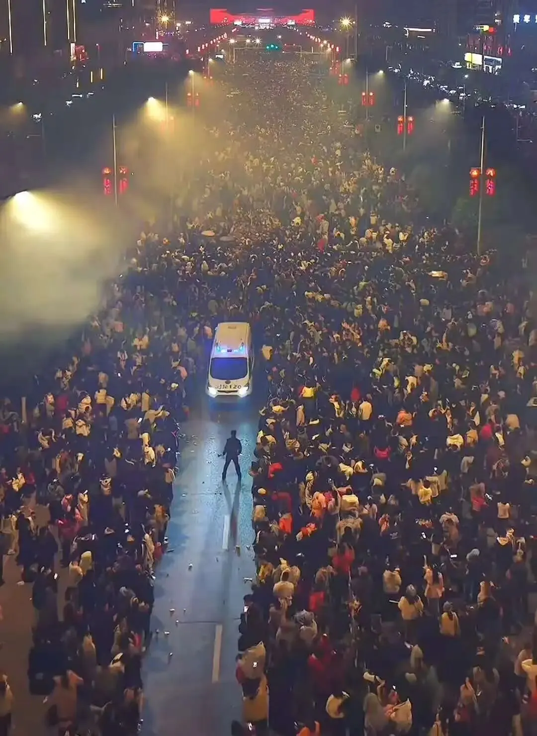 ▼湖南浏阳烟花秀数万名游客为救护车让出1.5公里“生命通道”,烟花暂停燃放数分钟