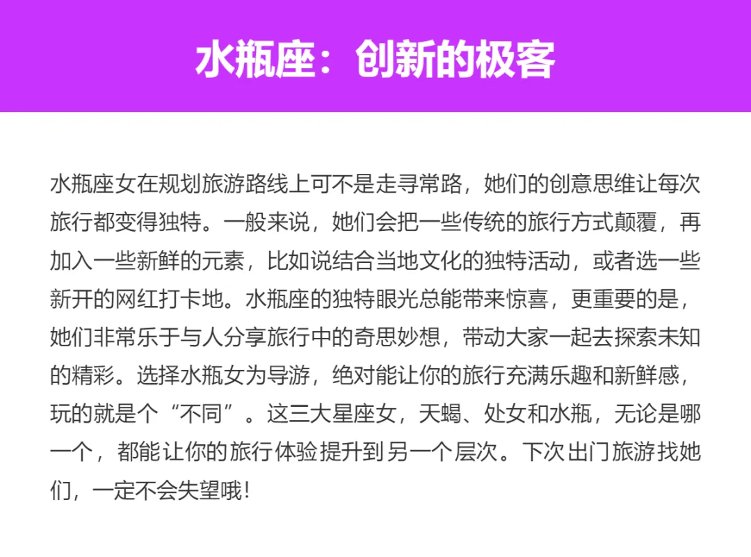 善于规划路线、出门旅游最佳导游的三大星座女!出门旅游选择合适的导游,那绝对是把游玩体验提升到一个新高度的好办法!有些女生就是那种擅长规划路线的“旅游女王”,无论去哪里,都会把行程安排得妥妥当当,让每一分每一秒都充满乐趣。对于她们来说,旅行不仅是一个放松的时刻,更是一个发挥自己能力的小舞台。今天就来聊聊那三大星座女,她们绝对是你出门旅游的最佳选择!