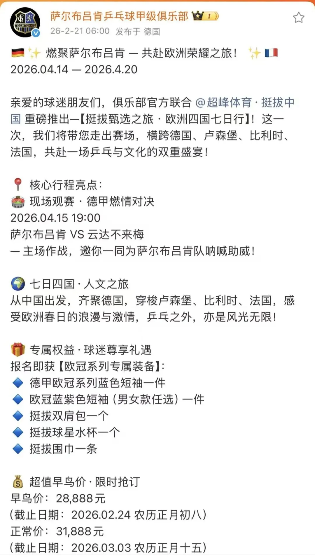 今天(2月21日)早上六点,萨尔布吕肯俱乐部发文:🇩🇪✨ 燃聚萨尔布吕肯 — 共赴欧洲荣耀之旅! ✨🇫🇷2026.04.14 — 2026.4.20。亲爱的球迷朋友们,俱乐部官方联合 @超峰体育·挺拔中国 重磅推出—【挺拔甄选之旅 · 欧洲四国七日行】!这一次,我们将带您走出赛场,横跨德国、卢森堡、比利时、法国,共赴一场乒乓与文化的双重盛宴!