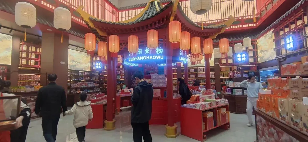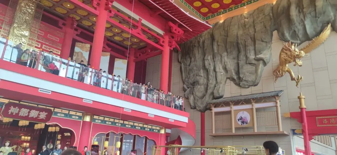 两层唐风建筑古香古色,飞檐翘角、雕梁画栋,一步一景全是洛阳文化。拍照打卡的游客络绎不绝,这里哪里是服务区,分明是沉浸式文旅景区!