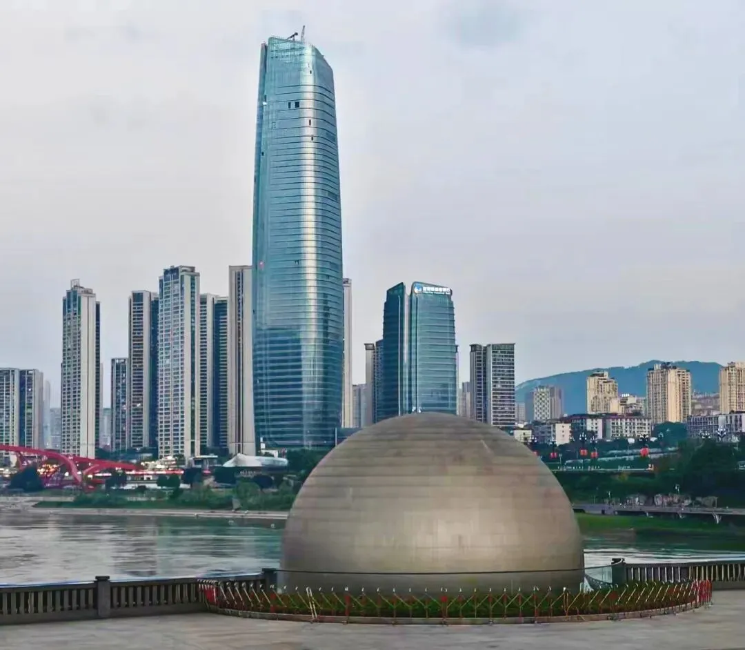 合江门地标广场“三江汇流肉眼可见,金沙江黄、岷江绿,撞到一起才慢慢混匀,那条分界线像大河分分合合。