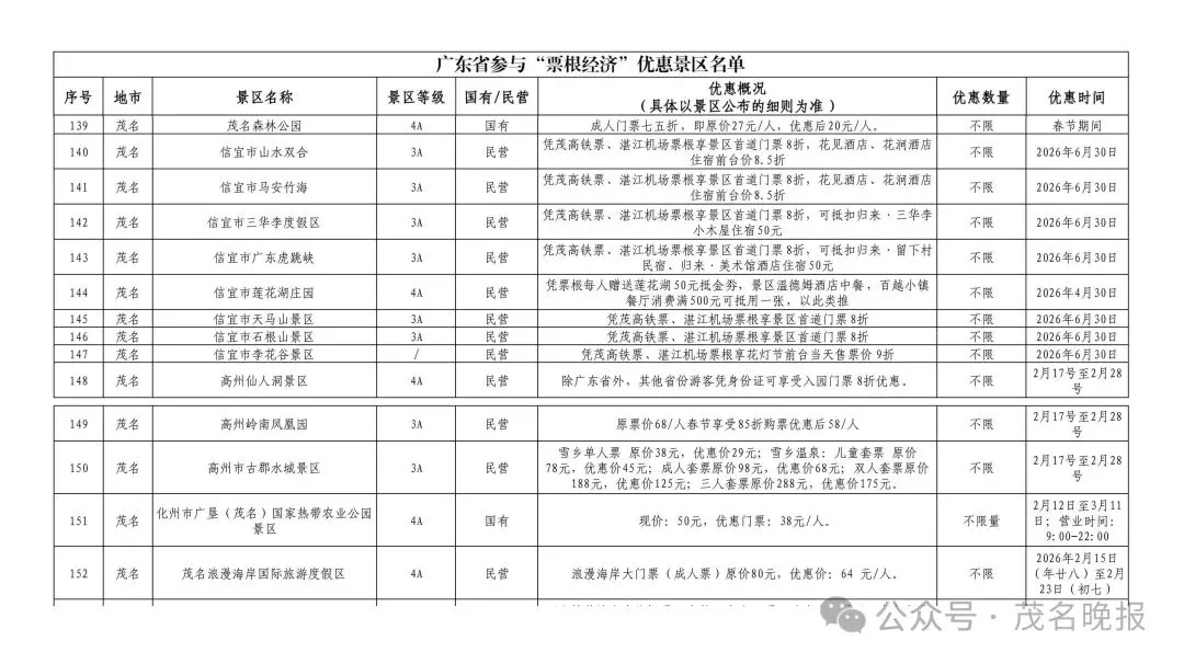广东推出“票根经济”专项优惠活动,游客凭机票、高铁票、跨省大巴票、大型演唱会门票等凭证,即可在全省参与的住宿企业和旅游景区享受专属折扣。活动覆盖春节假期,部分景区及住宿优惠将持续至2026年3月31日,为元宵及节后错峰游提供充裕选择。茂名地区多家酒店和景区参与,如花涧度假酒店、茂名森林公园、信宜市山水双合等,提供门票折扣和住宿优惠,让“一张票根游遍广东”成为现实。