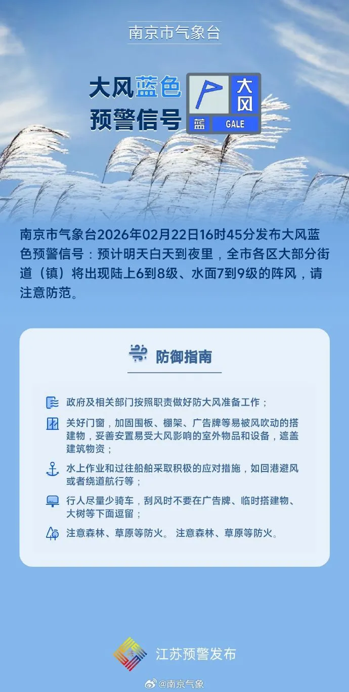 南京市气象台2月22日16时发布的大风警报和全市天气预报