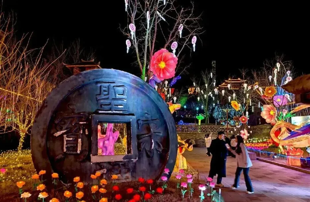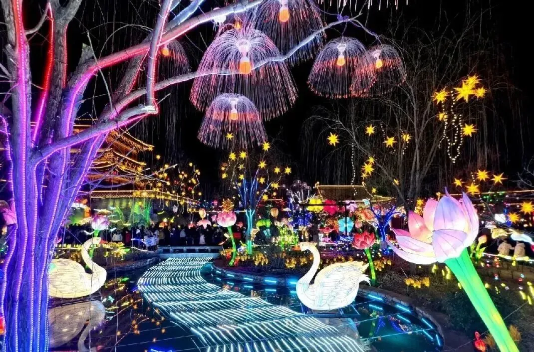 万盏华灯依古建布局铺展,五大主题灯组与红墙飞檐相映成辉,融合传统灯艺与现代光影、尽显河东盐韵与国潮新风。