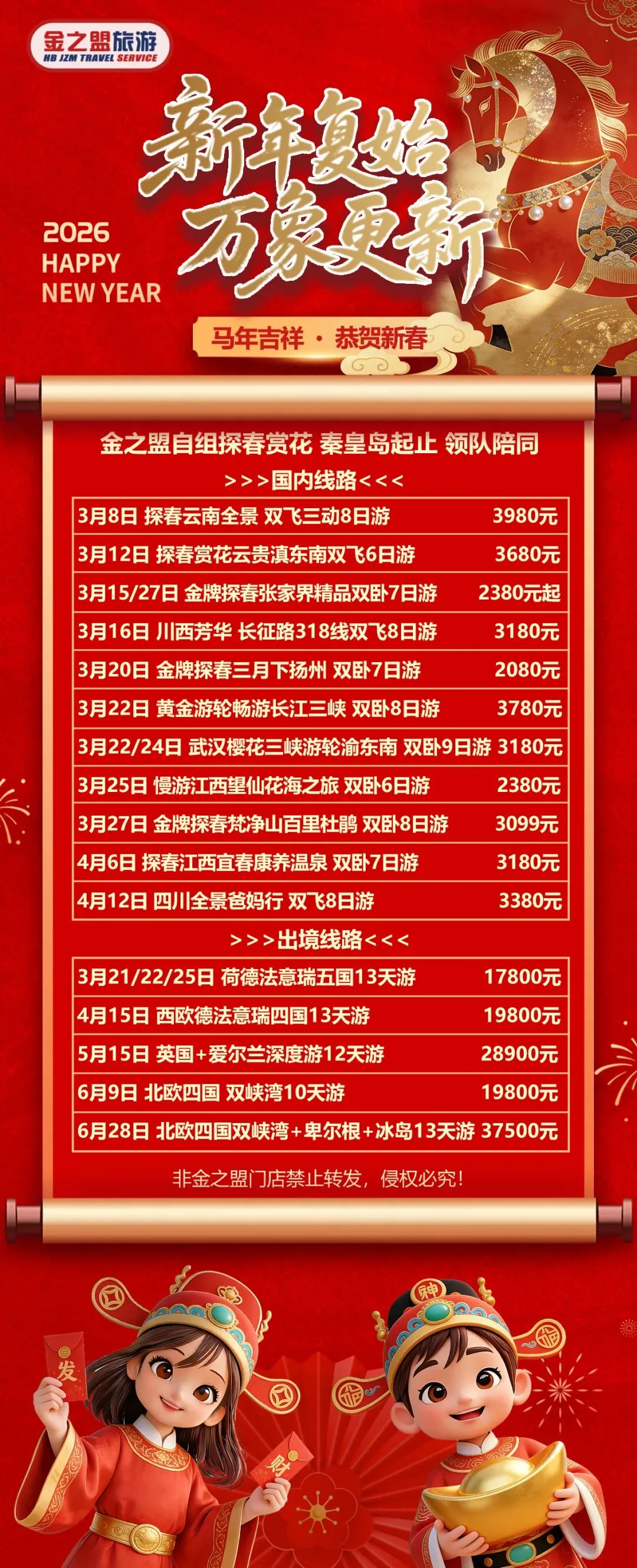 春日不等人,花事不辜负。2026探春赏花旅游线路已全面上线,名额有限,先到先得!告别繁琐规划,放下生活疲惫,收拾好行囊,跟着我们一起,踏春而行,赏遍山河花海,捕捉春日里的每一缕温柔与惊喜,把马年的第一份美好,定格在这漫山遍野的繁花之中。