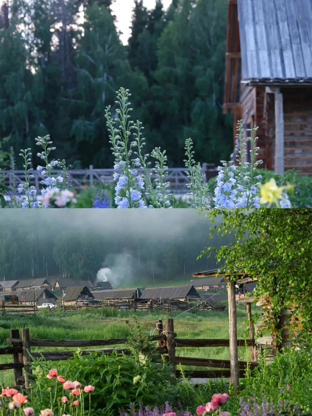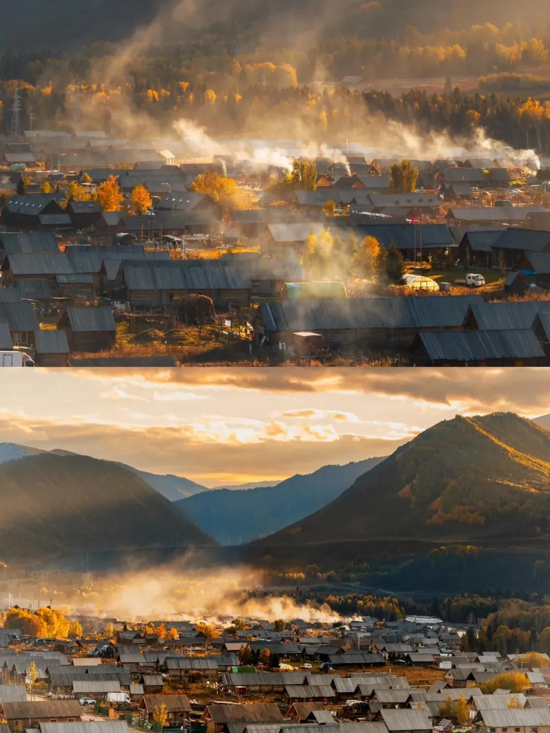 真实体验:看着晨雾从山谷缓缓升起,粉色朝霞染红河面,木屋在雾中若隐若现,炊烟袅袅升起,仿佛闯入仙境。这一刻,你会明白为什么那么多人说“禾木是神的自留地”。
