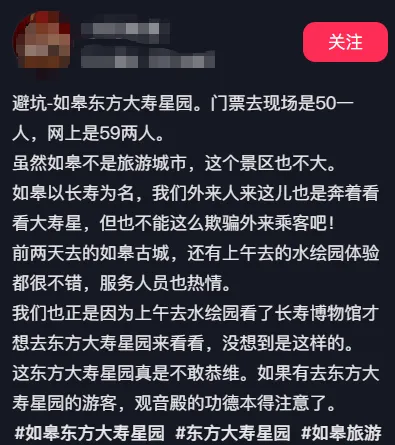 据该网友描述,其如皋之旅的前半段堪称完美。在如皋古城漫步,在水绘园、长寿博物馆感受深厚的长寿文化与优质服务,正是这些良好体验促使他专程前往同样以“长寿”为宣传点的东方大寿星园。