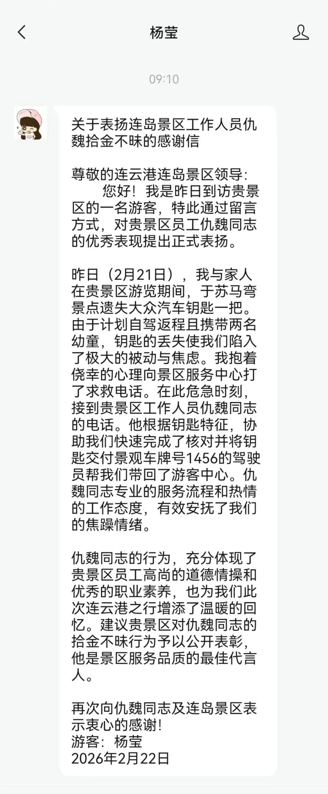 由于计划自驾返程,且同行还携带两名幼童,钥匙丢失后,一家人瞬间陷入焦虑与被动,情急之下向景区服务中心求助。接到求助后,景区秩序部工作人员仇魏第一时间与杨莹女士取得联系,耐心询问钥匙具体特征,快速完成信息核对。核对无误后,仇魏迅速协调景区车牌号为1456的驾驶员,将钥匙安全送回游客中心,为一家人解了燃眉之急。事后,杨莹女士特意写下表扬信,由衷感谢仇魏同志拾金不昧、乐于助人的行为,还建议景区对其予以公开表彰,称赞他是连岛景区服务品质的最佳代言人。