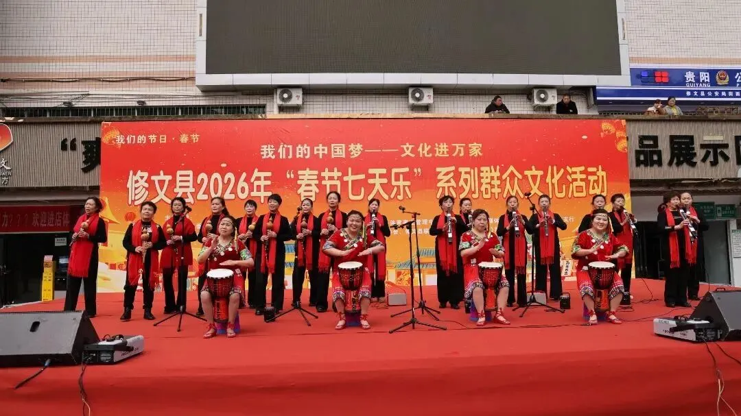 为丰富群众和游客的精神文化生活,修文县精心策划了2026年“春节七天乐”系列群众文化活动,从正月初一至初七,在县体育馆外场持续上演。气势磅礴的开场舞《龙的传人》、精彩绝伦的文艺演出、热闹非凡的游园活动,为现场观众送上了一道道精美的文化大餐。景阳街道举办的跨区文艺演出,汇聚了15个社区及民间文艺队的200余名演职人员,45个自编自导的节目,展现了修文群众积极向上的精神风貌。